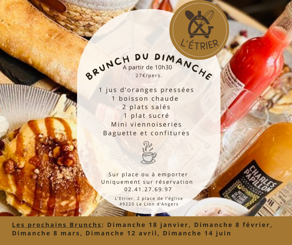 L'Etrier 2 place de l'église, Le Lion d'AngersVenez vous réveillez à l’Etrier, en amoureux, entre amis ou en famille et (re)découvrir la gourmandise d’un brunch !Le petit déjeuner mélangé au déjeuner pour toujours plus de saveurs qui vont régaler vos papilles.Du salé au sucré (re)découvrez les plats réalisés par Géraldine pour toujours plus de plaisir ! N’oubliez pas...